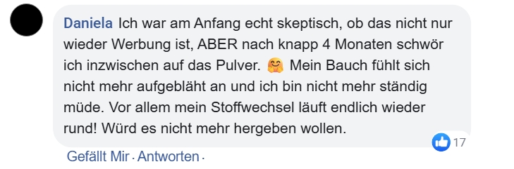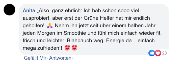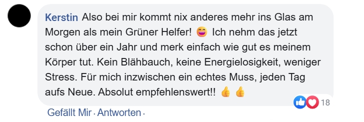 Der Grüne Helfer ist mein täglicher Begleiter geworden, der mir spürbar zu mehr Energie, weniger Blähungen und einer nachhaltig besseren Lebensqualität verhilft. Besonders wenn du wie ich unter Müdigkeit, Stress oder einem trägen Stoffwechsel leidest, kann ich dir das Pulver absolut empfehlen – für mich ist es aus meiner täglichen Routine nicht mehr wegzudenken!